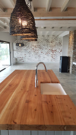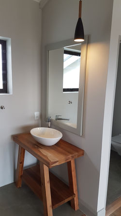 Simplicity in design and function epitomises this house. Set on a large stand in Eastford Glen this house took advantage of the magnificent views onto the Knysna Lagoon. Composite materials were used in the structure of conventional brick as well as a timber frame first floor finished off in sustainable Blackwood flooring. Large spans were achieved with a single steel I beam on the deck for limitless vistas from the Garapa deck. The extensive landscaping really complements this house with large rock boulders that form platforms,niches and steps set between indigenous plants. The house is off-grid thanks to water tanks and Photovoltaic panels.
